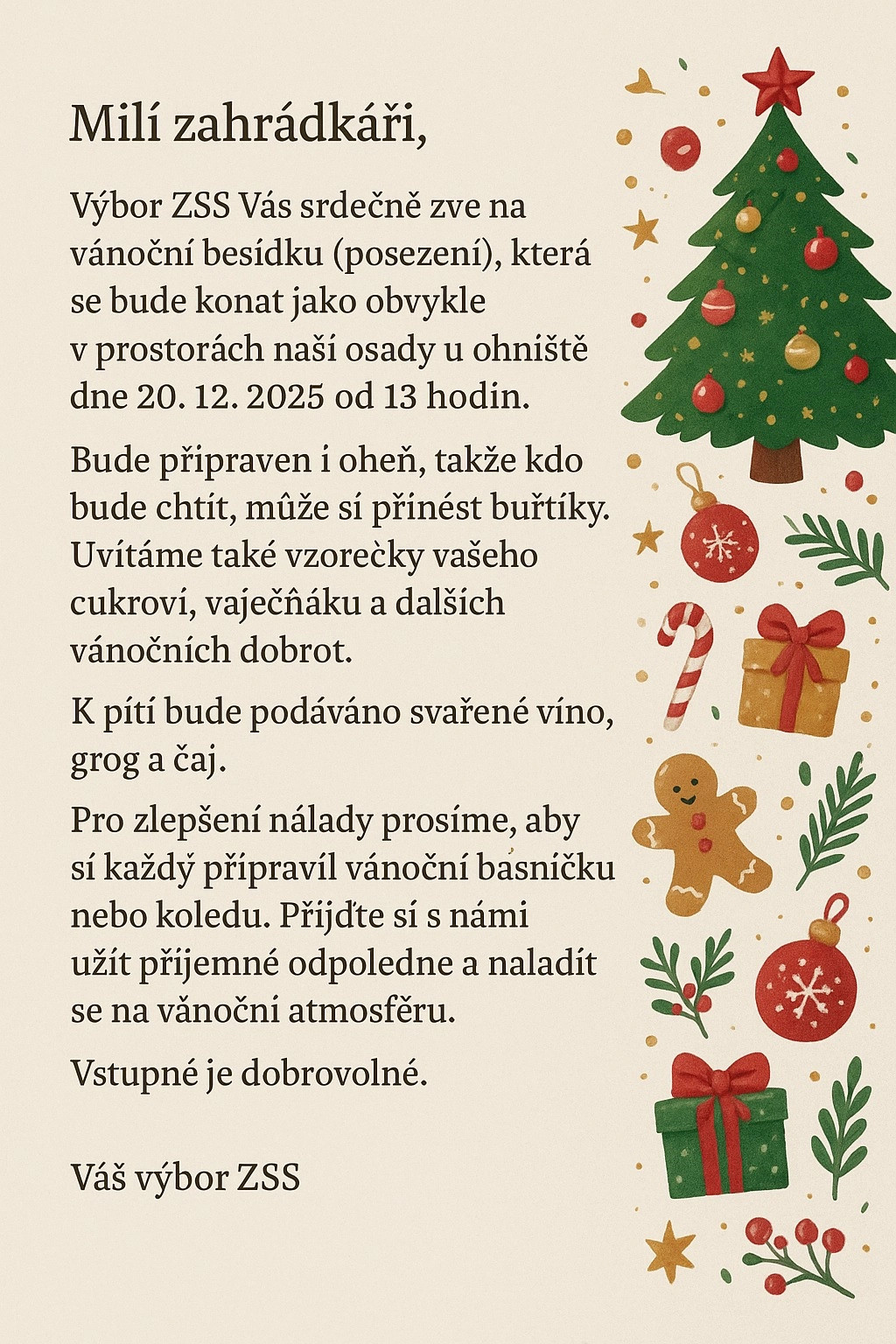 Zahrádkářský spolek Střížkov zve své členy na povinnou brigádu, která se bude konat 11.10.2025 od 9.00 hod. - do 12.00 hod. Bližší info najdete ve svém emailu :-).